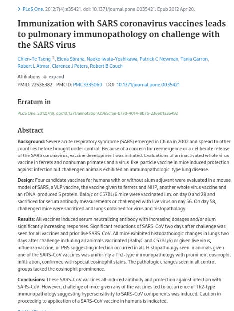 The study, which is American even though the first author has a Chinese name, is titled: “Immunization with SARS coronavirus vaccines leads to pulmonary immunopathology upon exposure to the SARS virus.” The study concludes: