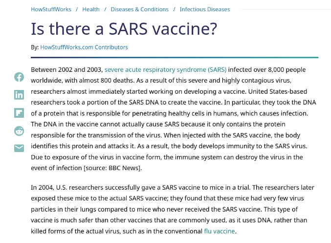 As can be seen from the summary provided by the website mentioned above, “...in 2004 U.S. researchers reportedly successfully used an experimental anti-SARS vaccine on mice; while in 2004, in China... researchers successfully vaccinated people with the SARS vaccine.” They then add that, since it takes 3 to 5 years to develop a vaccine, that human study had laid the groundwork for potentially confronting a future epidemic.