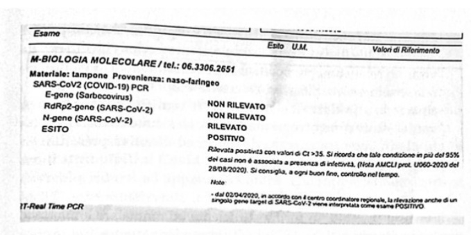 In this honest certificate it is clearly stated that, since the positivity result was obtained with more than 35 PCR cycles, “... such condition, in more than 95% of cases, is not associated with the presence of infectivity.”