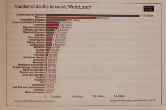 In 2017, the total deaths from respiratory diseases (pneumonias) and respiratory infections (flu and similar) was 3.91 million + 2.56 million = 6,470,000 deaths! If we also add tuberculosis, considered a respiratory pathology as well, we reach a total of 7,650,000!