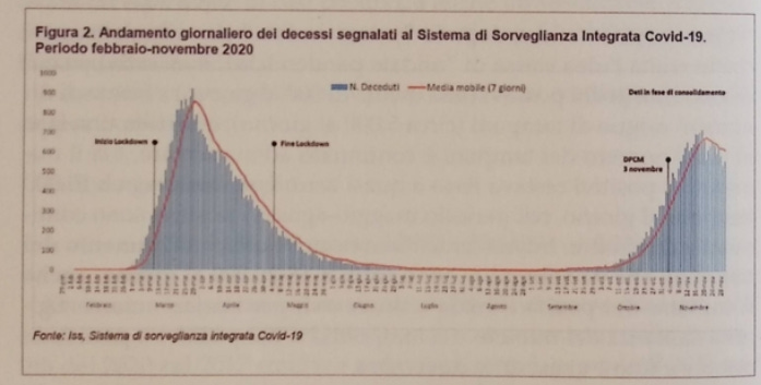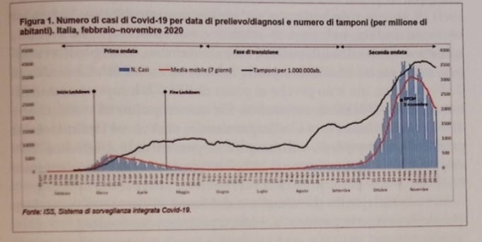 In essence, this graph confirms that it is a PCR pandemic. As can be seen, the increase in cases is perfectly parallel to the increase in swabs. This is an important datum: if the pandemic had truly risen in October and November, there should have been an increased ratio between cases and swabs, i.e., a higher percentage of positive cases for the same number of swabs. In concrete terms: in September, an average of 15,000 swabs were performed per day, producing about 1,500 positive cases. Since this graph is presented to justify the transition from a phase of pandemic cessation, in the months of June to September, to a pandemic explosion, the famous second wave, in October and November, this second wave should have led to, say, 3,500 positives still on the same 15,000 swabs. Instead, we do reach an average of 3,500 positives, but only because we go from 15,000 swabs in September to over 40,000 in November. From this point of view, one can say the opposite, namely that the pandemic, as defined by swab positivity, decreased in percentage, because if 1,500 cases out of 15,000 swabs are 10%, 3,500 cases out of 40,000 swabs are 8.75%.
