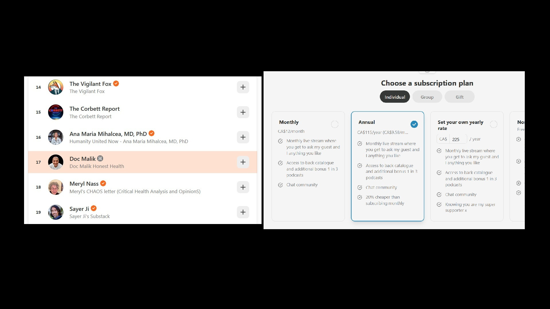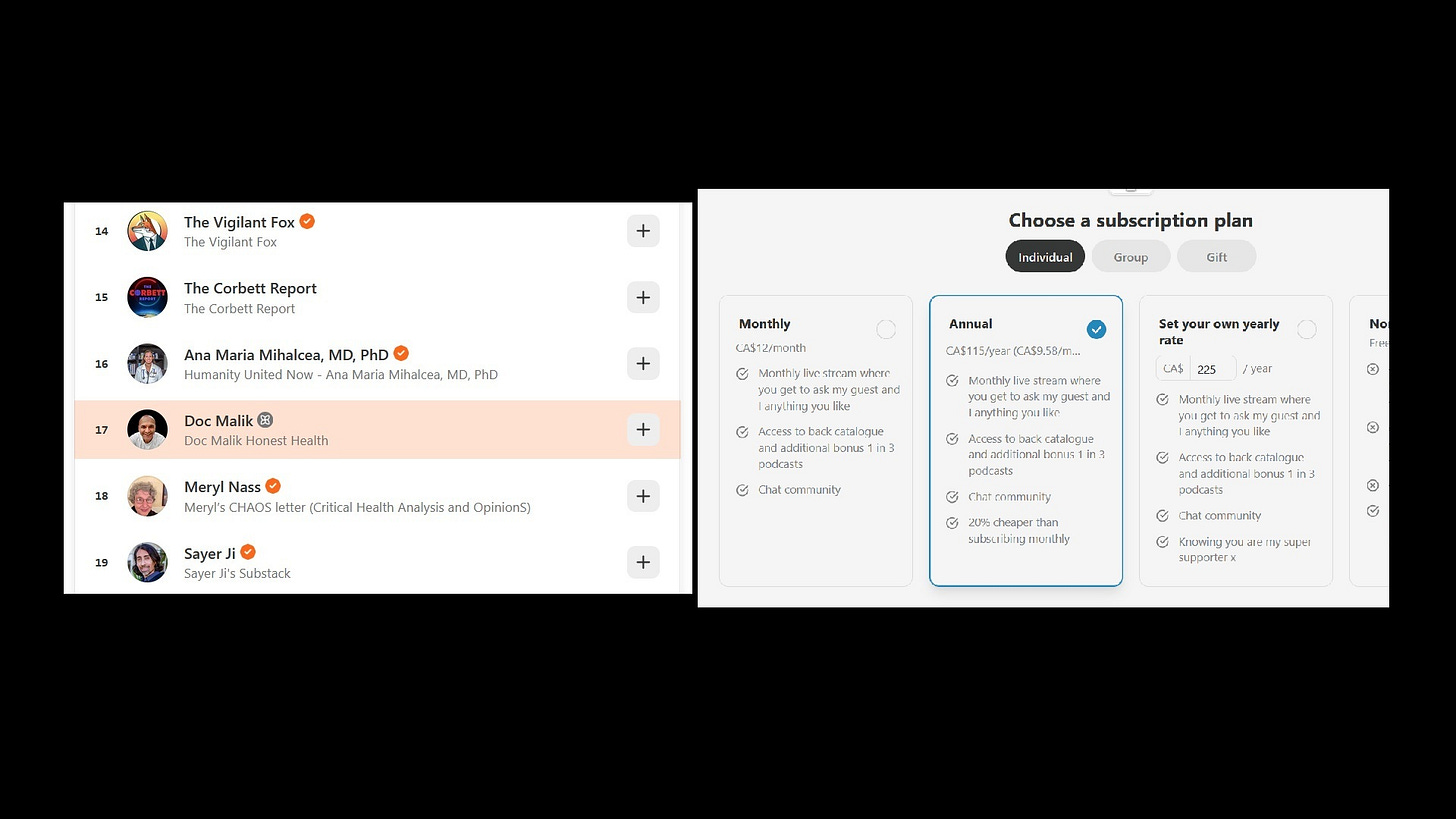 Under communism, could the “resistance” have podcasts and blogs where they earn large incomes “fighting for freedom?” Doc Malik may not have his checkmark turned on, but it’s easy enough to deduce from the bestsellers list on Substack that he’s making a good income from his podcast/blog. He’s listed as number 17 and is surrounded by others with the solid orange checkmark. This implies he likely has thousands of paid subscribers. On the low end, that means he’s earning no less than $115,000 (from Substack alone) with just 1,000 subscribers—in Canadian dollars, since that’s where I live—and could potentially be earning up to $1,035,000 with 9,000 paying subscribers. Not bad for living under communism and “fighting for freedom.”