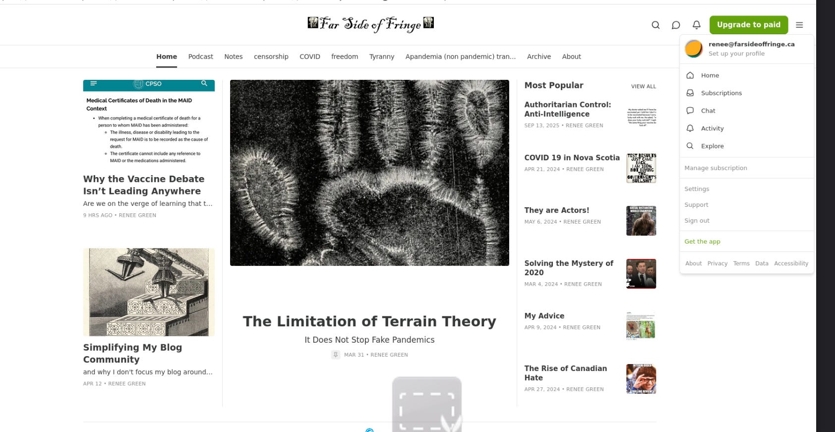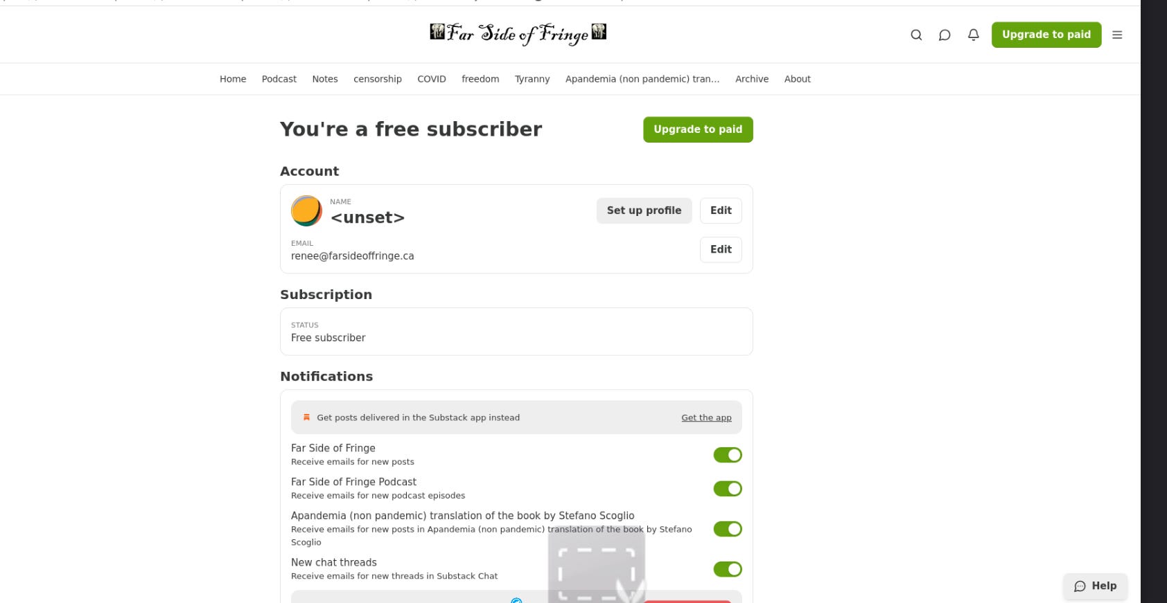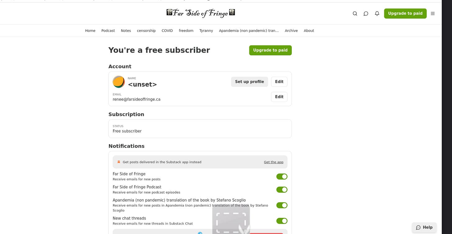 Go to farsideoffringe.ca. If you are signed into Substack, you will see three lines in the upper right corner—click on “Manage Subscription.”