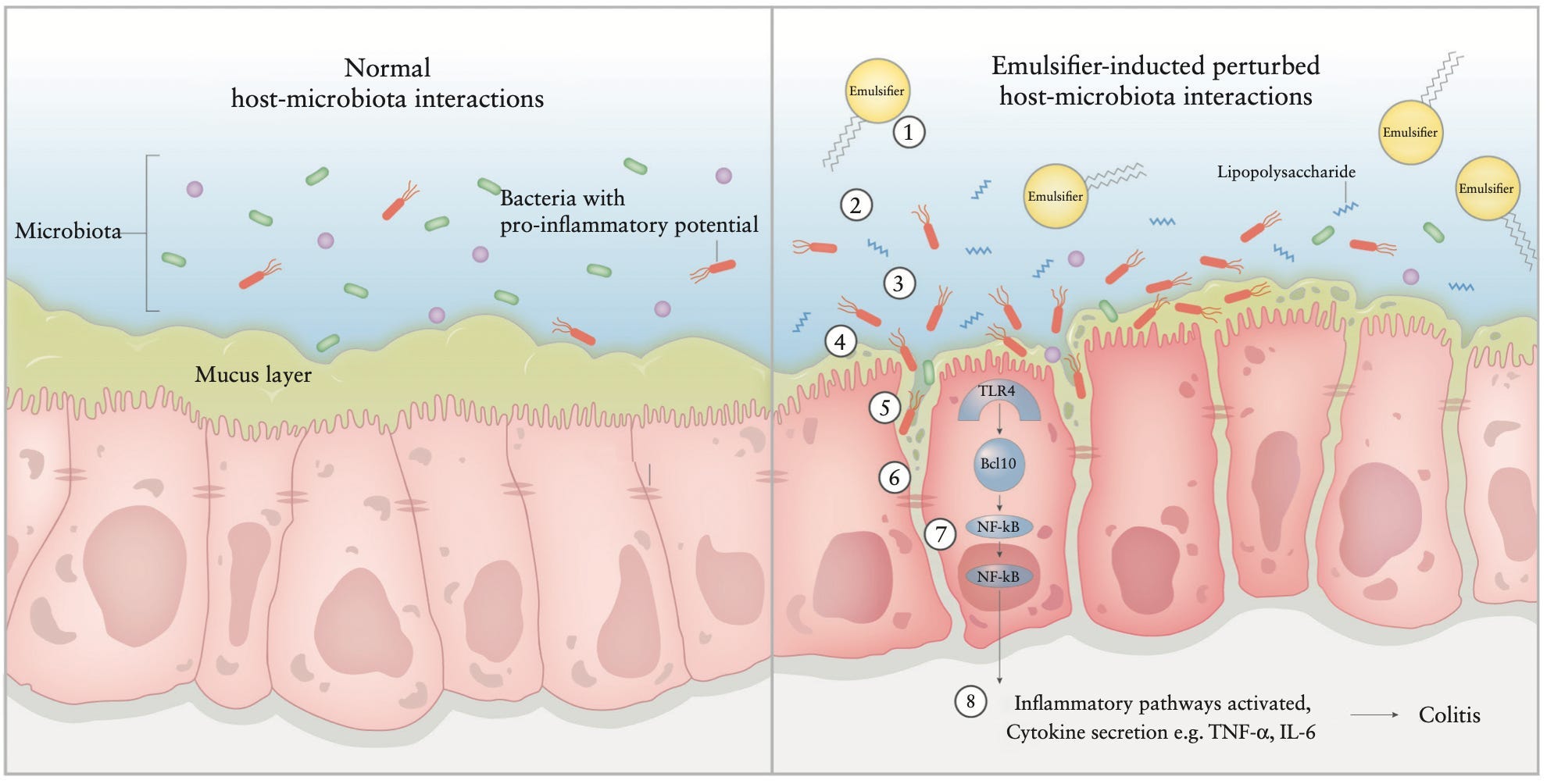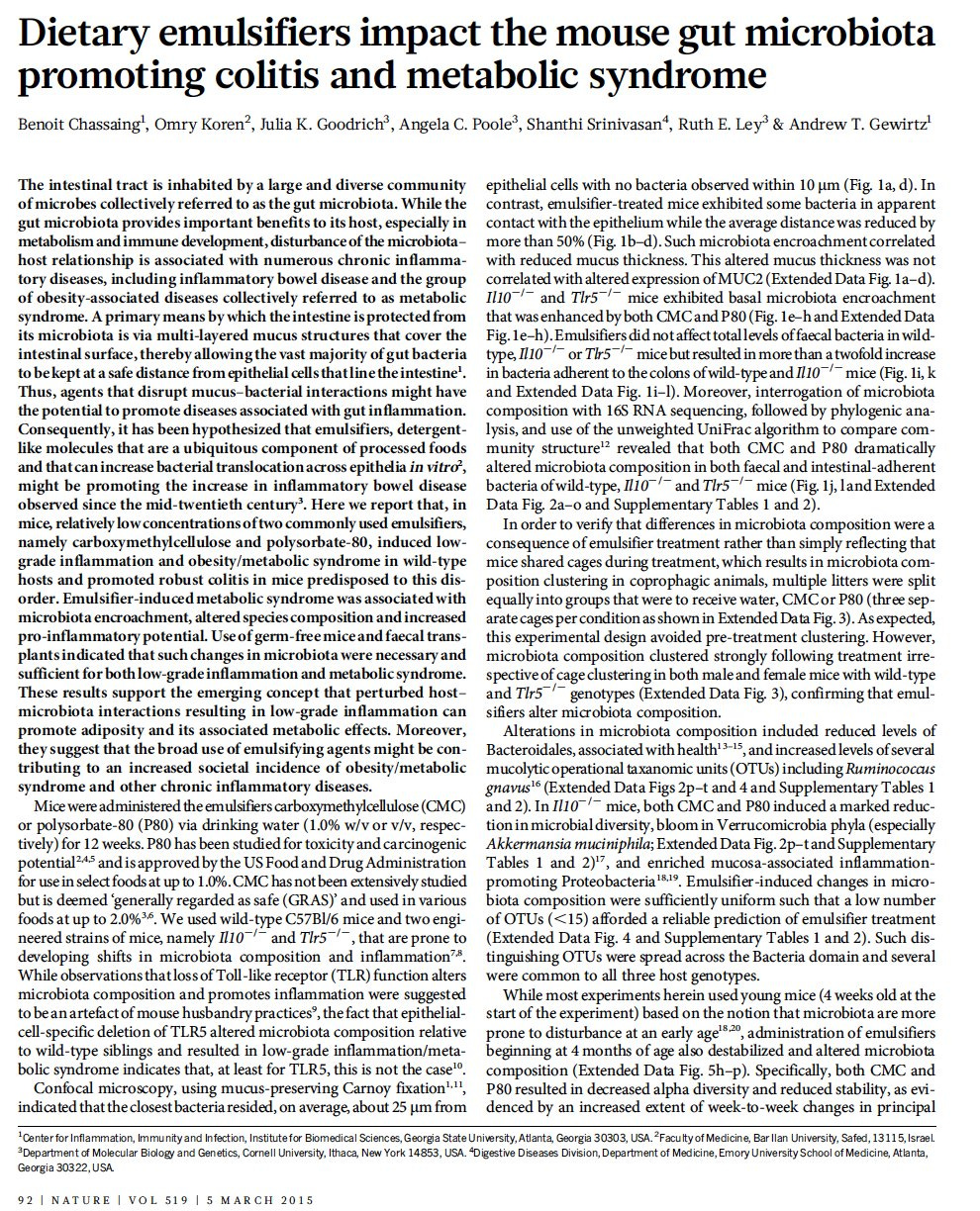Dietary emulsifiers impact the mouse gut microbiota promoting colitis and metabolic syndrome https://www.nature.com/articles/nature14232
